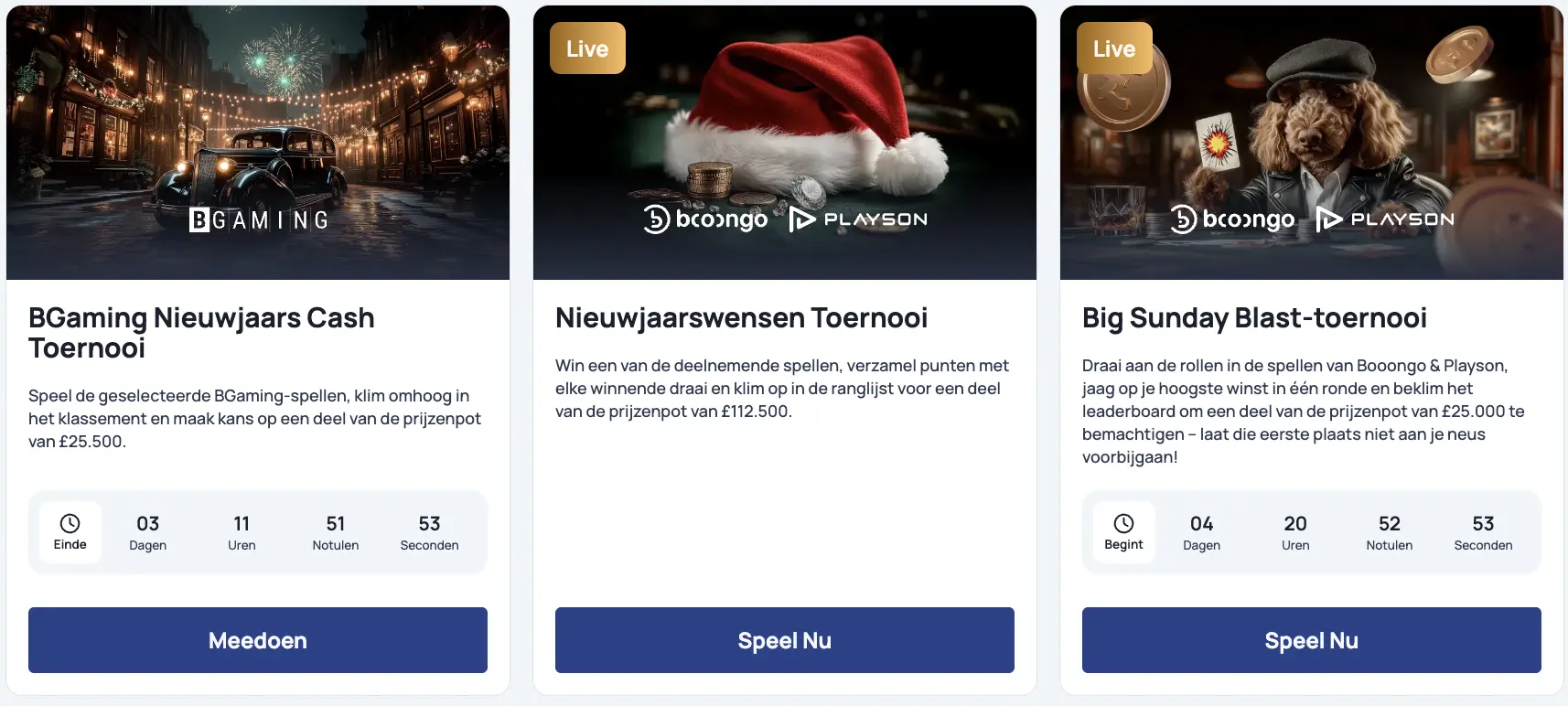 | Big Sunday Blast toernooi | Spin op specifieke Playson en Boongo games en verzamel punten. We organiseren dit toernooi elke zondag. | €25.000 |