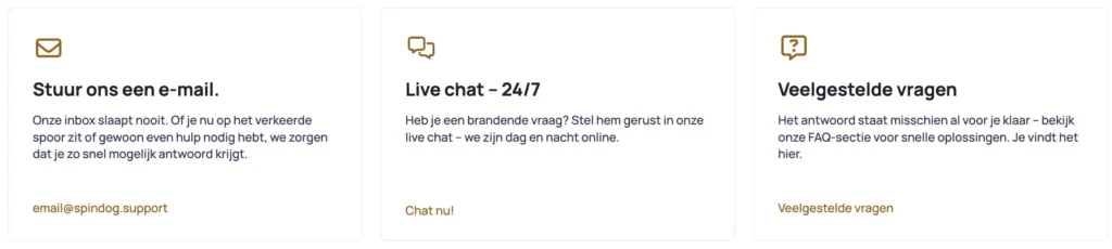 De live chat geeft je binnen enkele minuten een gepast antwoord terwijl de SpinDog casino medewerkers je via e-mail binnen 1 dag een antwoord zullen sturen.