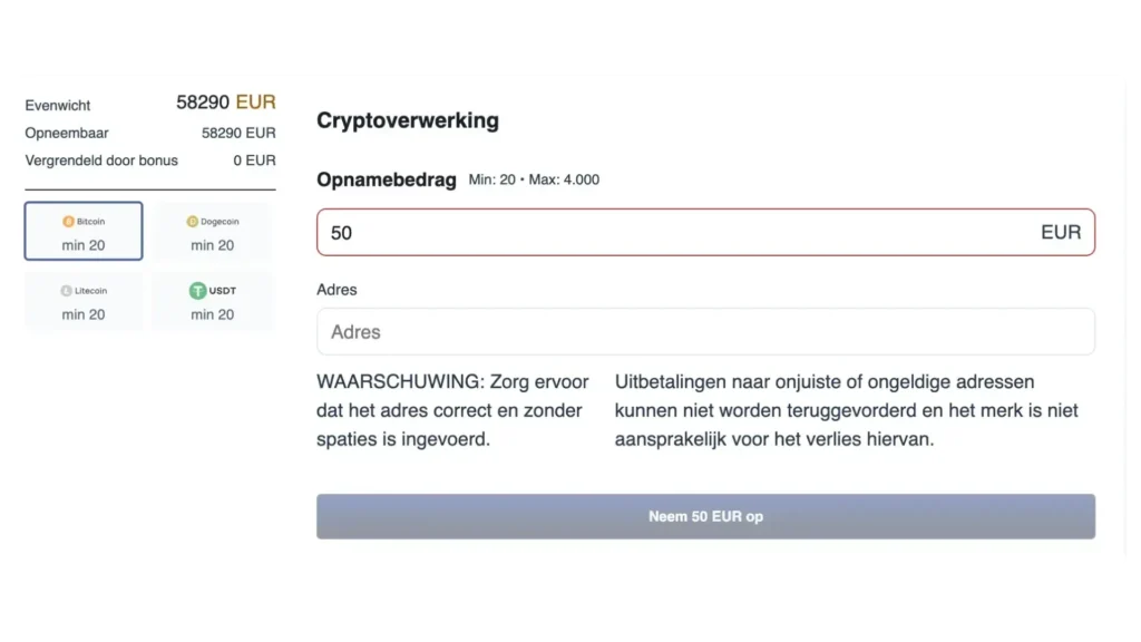 | Bitcoin | Kopieer het adres van je eigen crypto wallet en plak het in het voorziene veld. Controleer nog even of alles juist is en bevestig je opname.. | €20 / €4.000 | Instant |
